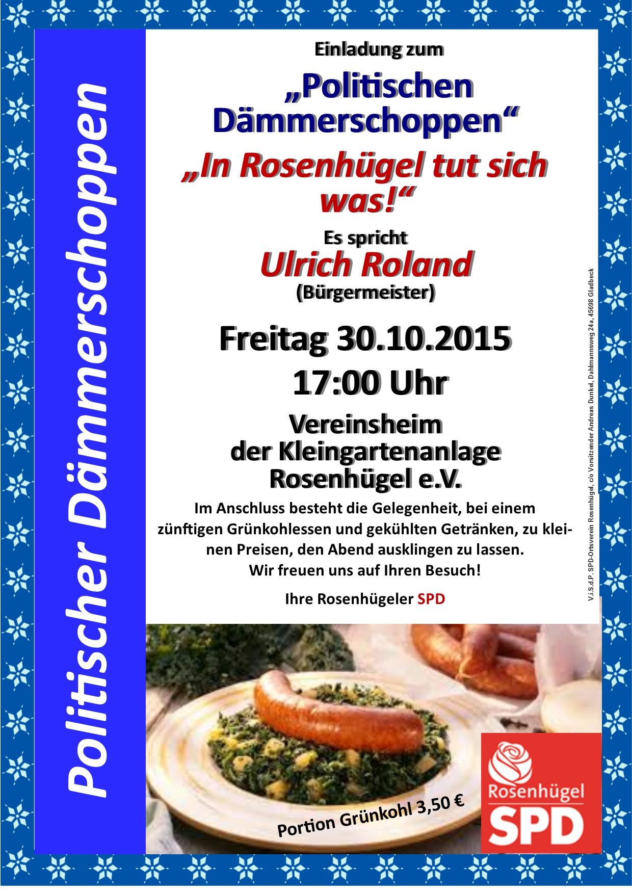 Am Freitag, den 30.Oktober 2015 veranstaltet die Rosenhügeler SPD ab 17:00 Uhr eine bürgeroffene Mitgliederversammlung als „politischen Dämmerschoppen“ im Vereinsheim der Kleingartenanlage Rosenhügel an der Vehrenbergstraße 50.