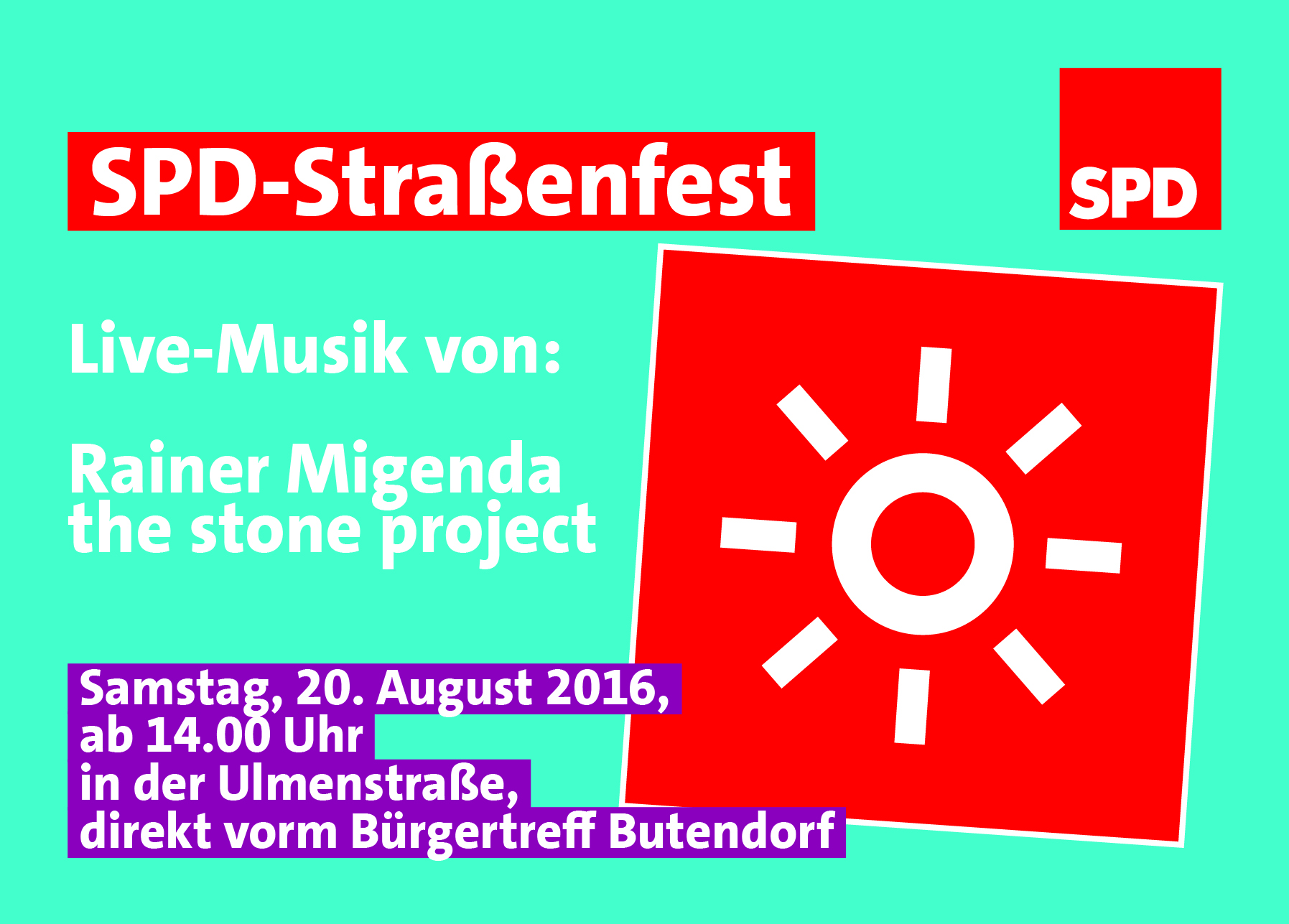 Am Samstag, den 20. August 2016 findet ab 14:00 Uhr auf der Ulmenstraße/ Ecke Landstraße direkt vorm Bürgertreff Butendorf, zum ersten Mal das große SPD-Straßenfest statt. Dieses Fest wird gemeinsam von der Butendorfer und der Rosenhügeler SPD ausgerichtet. Die Sozialdemokraten aus dem Gladbecker Süden haben aus diesem Anlass für ein umfangreiches Programm gesorgt.