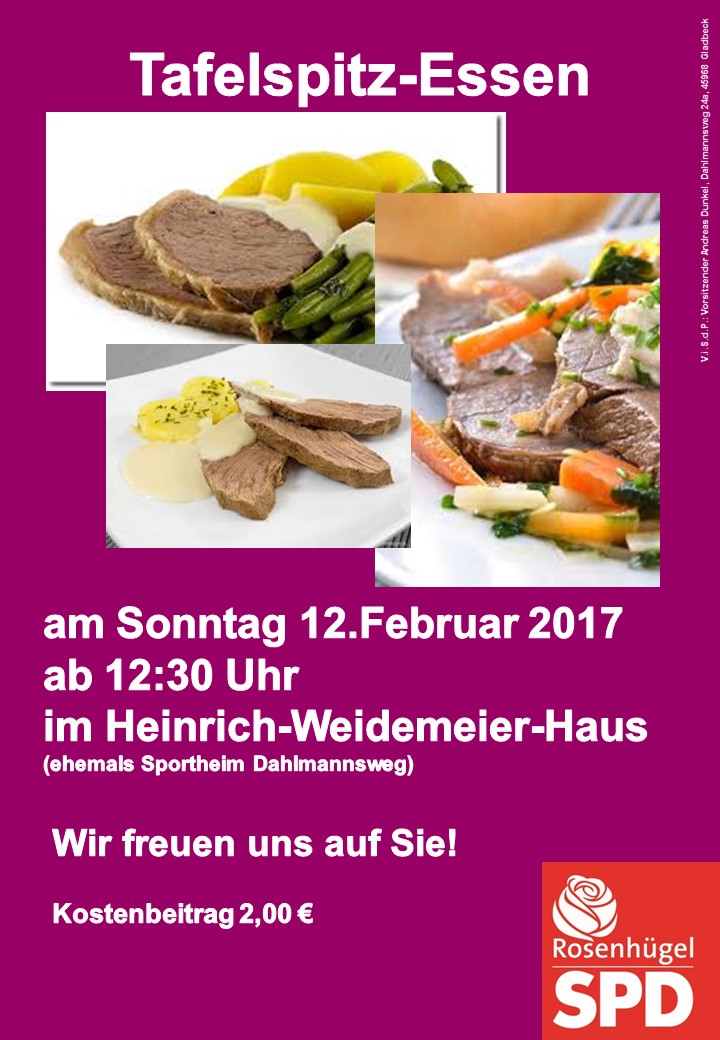 Rosenhügel | Die Rosenhügeler SPD bietet am Sonntag, den 12.Februar 2017 ab 12:30 Uhr im Heinrich-Weidemeier-Haus wieder einen Mittagstisch all denjenigen an, die es leid sind allein zu Tisch zu sitzen. Wir machen diese Angebot vor allem Senioren, Alleinstehenden und Alleinerziehenden. Aber auch alle Nachbarn sind herzlich eingeladen mit uns zu Tisch zu sitzen – und neben dem gemeinsamen Mittagessen ist auch noch Zeit um ein bisschen zu Klönen und die Nachbarn zu treffen. Bei einem Tässchen Kaffee nach dem Essen geht das nochmal so gut.