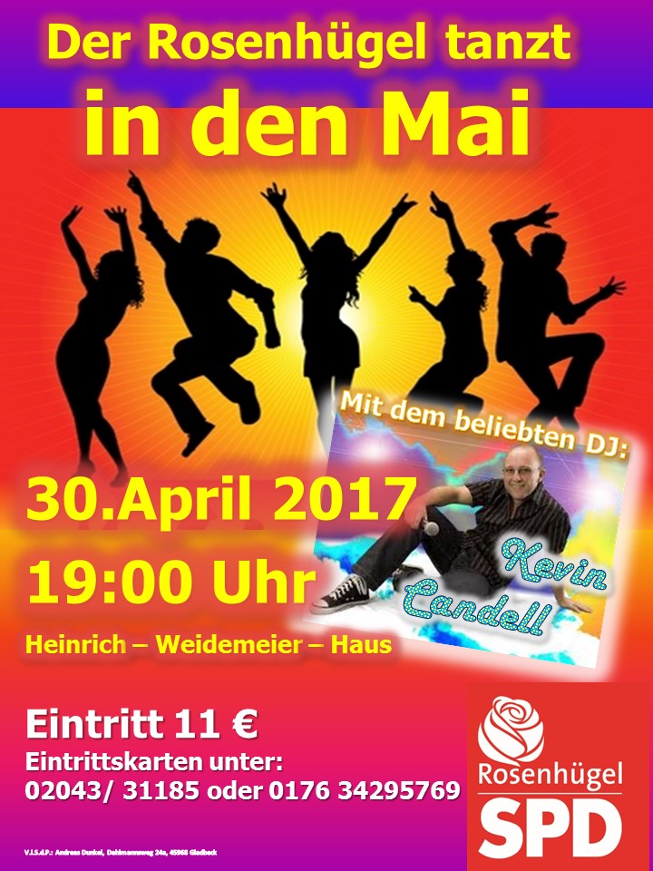 Am Sonntag, den 30. April 2017 lädt der SPD-Ortsverein Rosenhügel wieder zum Tanz in den Mai recht herzlich ein. Los geht es ab 19:00 Uhr im Heinrich-Weidemeier-Haus (HWH) am Dahlmannsweg. Für die gute Stimmung sorgt diesmal wieder der Duisburger Schlagerbarde Kevin Candell, Durch seine vielen Auftritte im Ruhrgebiet und im Münsterland ist Kevin bekannt geworden. Seit 2009 ist seine CD mit dem, wie er selber sagt: „Song, für alle Frauen dieser Welt“, mit den Titeln „Lieber eine Zicke im Haus“ und „Eine affengeile Nummer“, auf dem Markt. „Lieber eine Zicke im Haus“ landete auf Anhieb in verschiedenen Hitparaden unter die TOP 20 und wurde mehrmals bei der Sendung „Frauentausch“ auf RTL II gesendet. Sein erstes Album „Ab in die Sterne“ erschien 2014 mit alten und neuen Songs. Kevin spielt nicht nur seine Hits sondern auch Aktuelles aus den Charts und auch Altbekanntes wird dabei sein – Musik zum Schwofen, bei der das Tanzbein geschwungen kann und das HWH wackeln lässt.