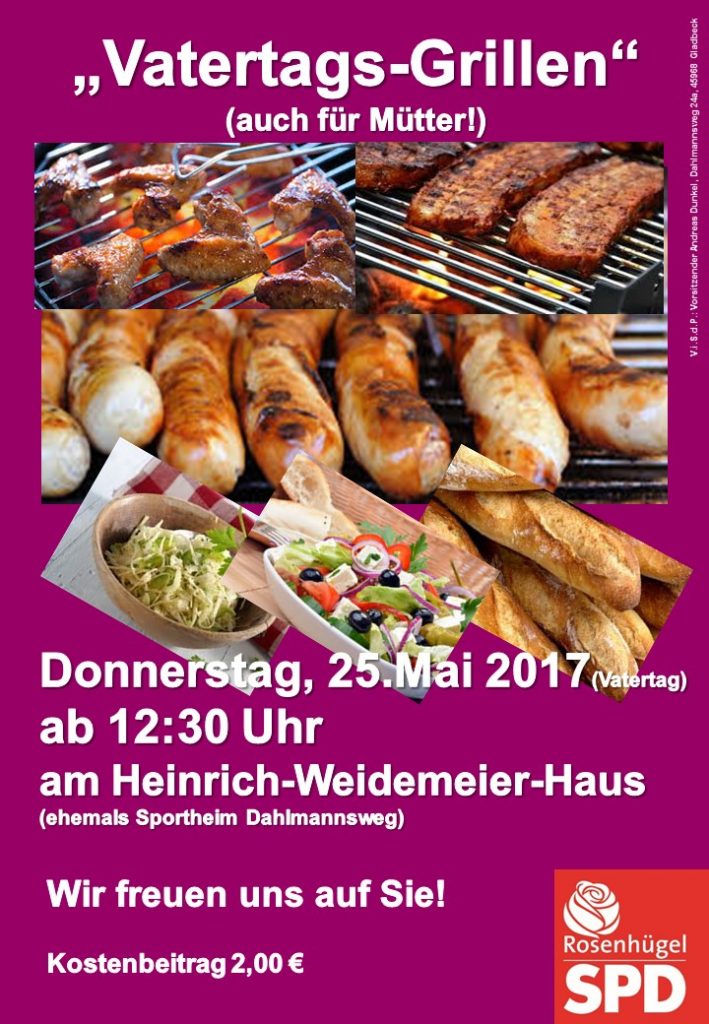 „Dieses Mal wird gegrillt. Das ist die Gelegenheit den Vatertag mit Muttern bei der SPD zu verbringen. An diesem Tag werden bei gutem Wetter sicherlich auch wieder viele Radler unterwegs sein. Auch diese laden wir herzlich ein, Station am Heinrich-Weidemeier-Haus zu machen. Aber auch alle Senioren, Alleinstehende und Alleinerziehende sind wieder herzlich eingeladen mit uns zu Tisch zu sitzen – und neben dem gemeinsamen Essen auch ein bisschen zu Klönen und die Nachbarn zu treffen. Bei allerlei Gegrilltem und frischem Salat geht das nochmal so gut. Das alles gibt es wie immer zum symbolischen Kostenbeitrag von 2,–€“, so der Ortsvereinsvorsitzende Andi Dunkel.