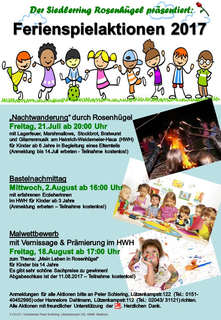 Peter Schiering abschließend: “Für die Umsetzung unserer Ideen haben wir nach Mitstreitern gesucht. Unterstützung haben wir bei der Rosenhügeler SPD gefunden. Der SPD-Ortsverein ist von den angebotenen Ferienspielaktionen begeistert und unterstützt uns dabei auch finanziell. Hierfür sagen wir herzlichen Dank – denn die Kinder sind unser aller Zukunft.“
