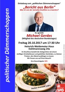 Am Freitag, den 20.Oktober 2017 veranstaltet die Rosenhügeler SPD ab 17:30 Uhr eine bürgeroffene Mitgliederversammlung als „politischen Dämmerschoppen“ im Heinrich-Weidemeier-Haus am Dahlmannsweg.