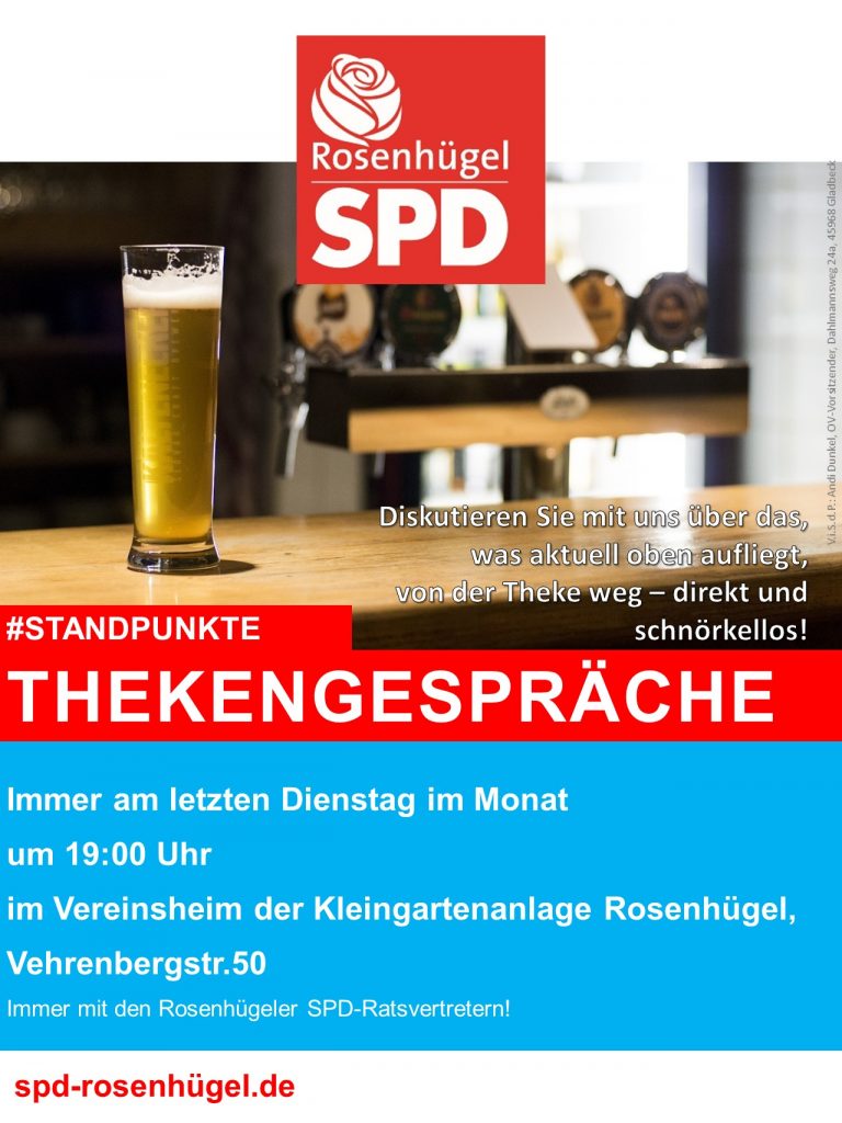 „Thekengespräche am nächsten Dienstag“ von SPD-Gladbeck-Süd | Mai 24, 2018 | Letzte Beiträge ERINNERUNG+++Thekengespräche der Neuen Rosenhügeler SPD am Dienstag, den 29.05.2018 ab 19:00 Uhr, Vereinsheim der KGA Rosenhügel Vehrenbergstr.50+++ERINNERUNG