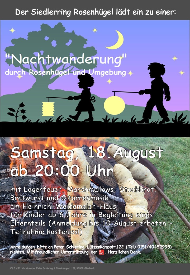 Gelsenkirchen/Gladbeck | Der Siedlerring Rosenhügel organisiert auch in den diesjährigen Sommerferien, genauer gesagt am 18.August, eine Nachwanderung für Eltern mit Kindern ab 6 Jahre durch Rosenhügel. Dabei darf ein Lagerfeuer mit Marshmallows und ´ne Bratwurst im Brötchen auf der Hand natürlich nicht fehlen. Zum Lagerfeuer gehört selbstverständlich auch noch Gitarrenmusik. Los geht’s damit ab 20:00 Uhr am Heinrich-Weidemeier-Haus am Dahlmannsweg.