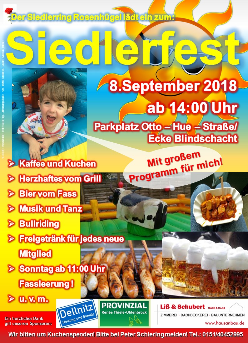 Marco Hackstein, Vorstandsmitglied im Siedlerrings Rosenhügel und Hauptorganisator des Festes erläutert: „Los geht es am Samstag, den 8.September ab 14:00 Uhr auf dem Parkplatz Otto-Hue-Straße/Ecke Blindschacht mit einem großen Kinderprogramm. Es stehen für die Kinder je nach Alter getrennt zwei Hüpfburgen zum Toben bereit. Des Weiteren können sie beim „Bullriding“ ihr Können unter Beweis stellen. Daneben bieten wir einen Kinderschminkstand an und das Spielmobil des Gladbecker Kinderschutzbundes wird seine Bewegungsspiele auspacken und unsere Kleinen zum Mitmachen animieren.“