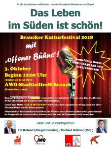 „Das vorbereitete Rahmenprogramm besteht aus Musik, Tanz, Gedichten und literarischen Rezitationen. Menschen die gerne einmal vor Publikum ihr künstlerisches Können unter Beweis stellen wollen, oder die Berufung verspüren zum Motto etwas beitragen zu wollen und gerne im Rampenlicht stehen, sollten sich bis zum 28.September 2018 unter den Telefonnummern 0151 162 39 352 (Andreas Schwarz) oder 0152 219 94 209 (Andi Dunkel) zur „offenen Bühne“ anmelden. Aber auch spontane Improvisationen sind gerngesehen“, sagt Andreas Schwarz, ebenfalls Mitorganisator der Veranstaltung und Braucker SPD-Chef, abschließend.