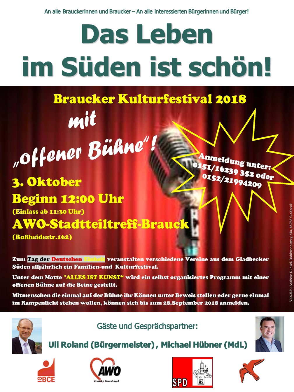 Brauck/ Gladbeck-Süd | „Zum Tag der Deutschen Einheit am Mittwoch, den 3.Oktober 2018 veranstalten die Vereine aus dem Gladbecker Süden alljährlich ein Kulturfestival – in diesem Jahr schon zum vierzehnten Mal. Die SPD-Brauck, der AWO-Ortsverein Brauck, die IGBCE Gladbeck Süd und der Verein Jugend ist Zukunft e.V. laden unter dem Motto „Alles ist Kunst“ recht herzlich ein“, so Andi Dunkel, Mitorganisator der Veranstaltung und Vorsitzender des Vereins Jugend ist Zukunft e.V.