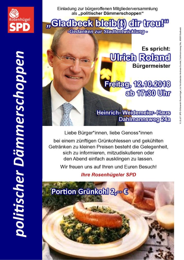 Bürgermeister Uli Roland wird zum Thema „Gladbeck bleib(t) dir treu!“ – Gedanken zur Stadtentwicklung – sprechen. Besonders wird er dabei auch auf die Dinge eingehen, die den Gladbecker Süden insbesondere Rosenhügel betreffen. Sicherlich wird er auch aktuelle kommunalpolitische Themen die gesamtstädtisch von Interesse sind, aus Sicht der Stadt bewerten und kommentieren.