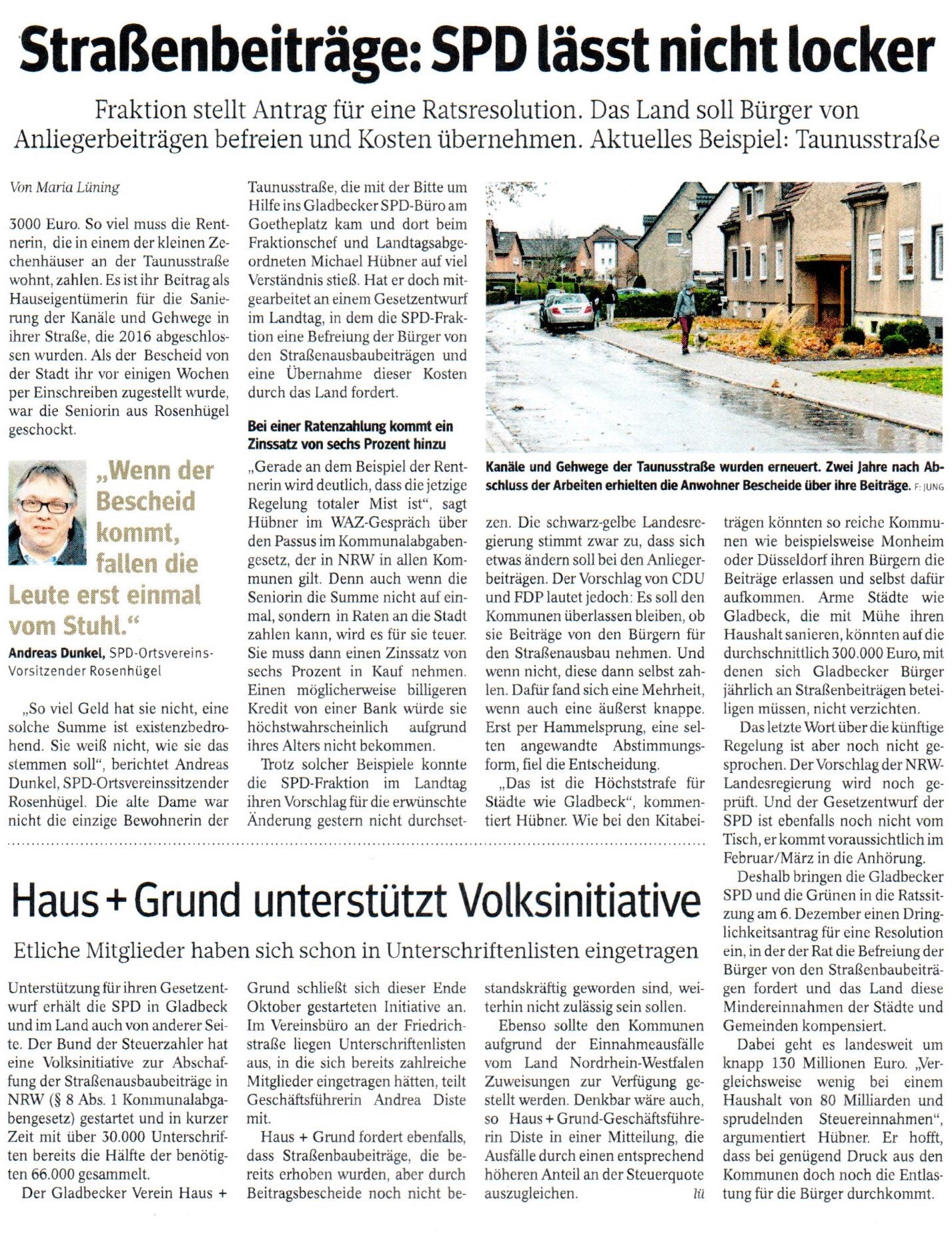„Manchmal sind Themen die die Politik gerade bearbeitet aktueller als man denkt. So wie das Thema Straßenausbaubeiträge, die die NRWSPD abschaffen will. Am letzten Donnerstag besuchten uns mehrere Anwohner*innen der Taunusstraße aus Rosenhügel im Fraktionsbüro der Gladbecker SPD. Sie beschwerten sich über die Heranziehungsbescheide nach §8 des Kommunalabgabengesetz (KAG) bezgl. des Ausbaus der Taunusstraße.