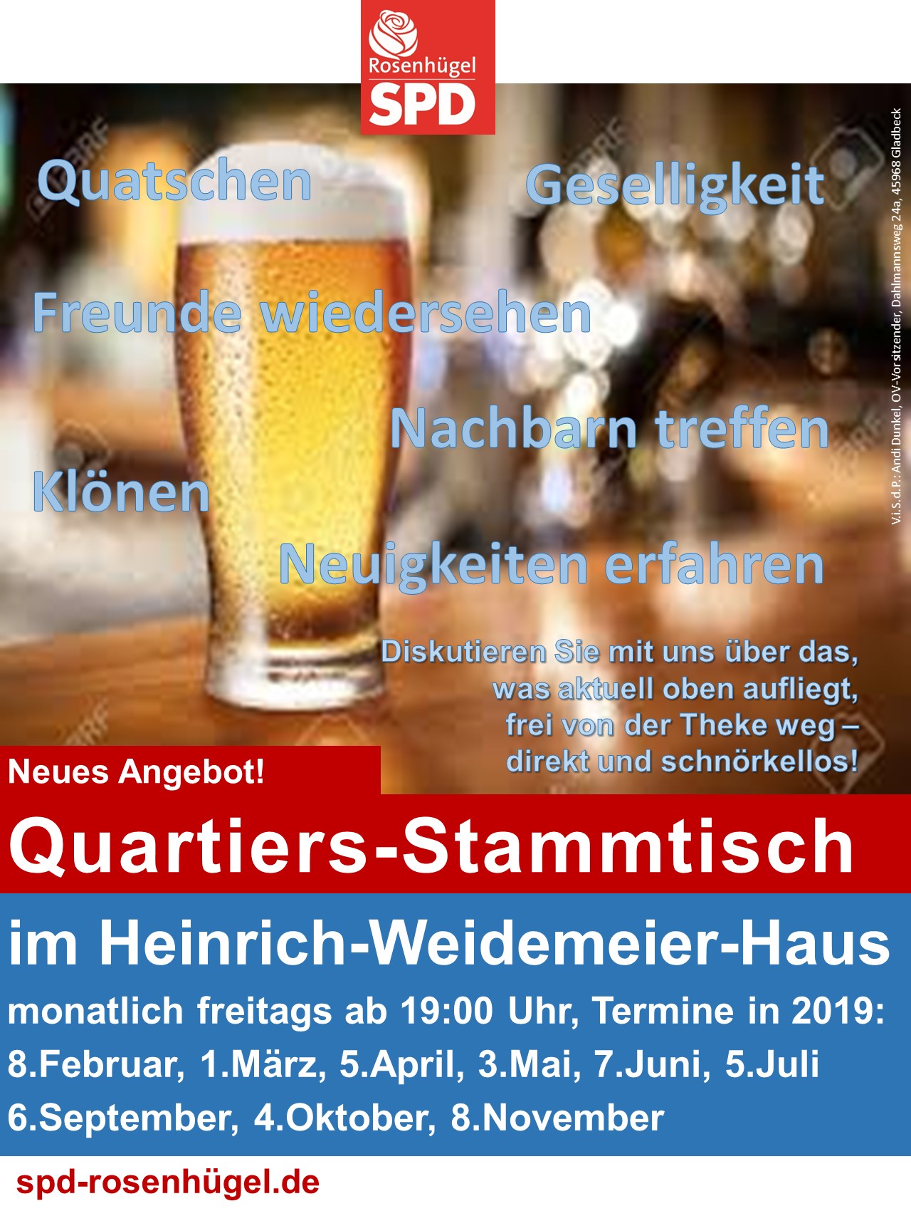 Ab 2019 erweitert die Rosenhügeler SPD ihr Angebot an die Bürger*innen um einen monatlichen Quartiers-Stammtisch. Damit wollen wir in geselliger Runde reden, diskutieren oder einfach nur klönen. Dazu laden wir jedermann ein – alle Bürgerinnen oder Bürger sind im Heinrich-Weidemeier-Haus willkommen. Ob bei einer Flasche Bier, Cola oder Wasser oder ´ner Tasse Tee oder Kaffee – wir suchen das Gespräch und wollen euch zuhören. Jeder hat etwas zu sagen – dumme Fragen gibt es nicht. Wir sind offen für konstruktive Kritik und Vorschläge. Ab und an werden wir anlässlich des Stammtischs kleine Events organisieren.