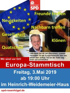 Rosenhügel | Die Rosenhügeler SPD lädt am Freitag, den 3.Mai ab 19:00 zu einem Europa-Stammtisch ins Heinrich-Weidemeier-Haus ein. Die Sozis aus dem Gladbecker Süden erwarten als Gast Jens Bennarend, den Gladbecker SPD-Kandidaten für die Europawahl am 26.Mai.