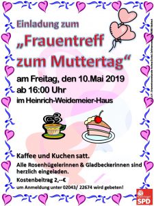 Rosenhügel | Am Freitag, den 10.Mai 2019 lädt die Rosenhügeler SPD zu einem Frauentreffen zum Muttertag ein. Alle Frauen sind ab 16:00 Uhr recht herzlich ins Heinrich-Weidemeier-Haus eingeladen um einen schönen Nachmittag zu verbringen. Für 2,–€ gibt es Kaffee und Kuchen solange der Vorrat reicht.