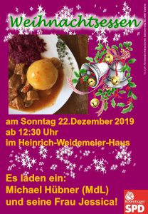 Der letzte Mittagstisch der Rosenhügeler SPD in diesem Jahr findet als Weihnachtsessen am Sonntag, den 22.Dezember 2019 ab 12:30 im Heinrich-Weidemeier-Haus statt. Wir servieren traditionell, Wildgulasch mit Klößen und Rotkohl sowie einen wirklich sehr leckeren Nachtisch. Besonders freut es mich, dass es diesmal gelungen ist, unseren Landtagsabgeordneten Michael Hübner und seine Frau Jessica zu gewinnen, dass Weihnachtsessen zu sponsern.