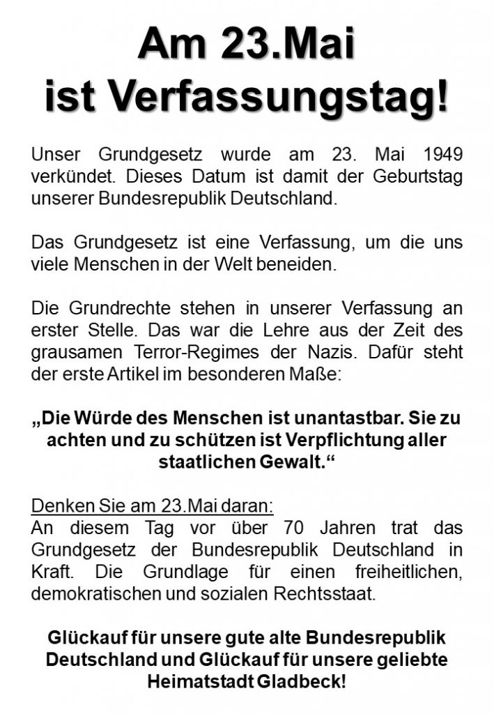 Da am 23.Mai auch noch Verfassungstag ist, bekommen alle die eine Currywurst bei uns bestellen, auch noch ein Exemplar des Grundgesetzes von uns überbracht. Unser Grundgesetz wurde am 23. Mai 1949 verkündet. Dieses Datum ist damit der Geburtstag unserer Bundesrepublik Deutschland. Das Grundgesetz ist eine Verfassung, um die uns viele Menschen in der Welt beneiden. Die Grundrechte stehen in unserer Verfassung an erster Stelle. Das war die Lehre aus der Zeit des grausamen Terror-Regimes der Nazis. Dafür steht der erste Artikel im besonderen Maße: „Die Würde des Menschen ist unantastbar. Sie zu achten und zu schützen ist Verpflichtung aller staatlichen Gewalt.“ An diesem Tag vor über 70 Jahren trat das Grundgesetz der Bundesrepublik Deutschland in Kraft. Die Grundlage für unseren freiheitlichen, demokratischen und sozialen Rechtsstaat.
