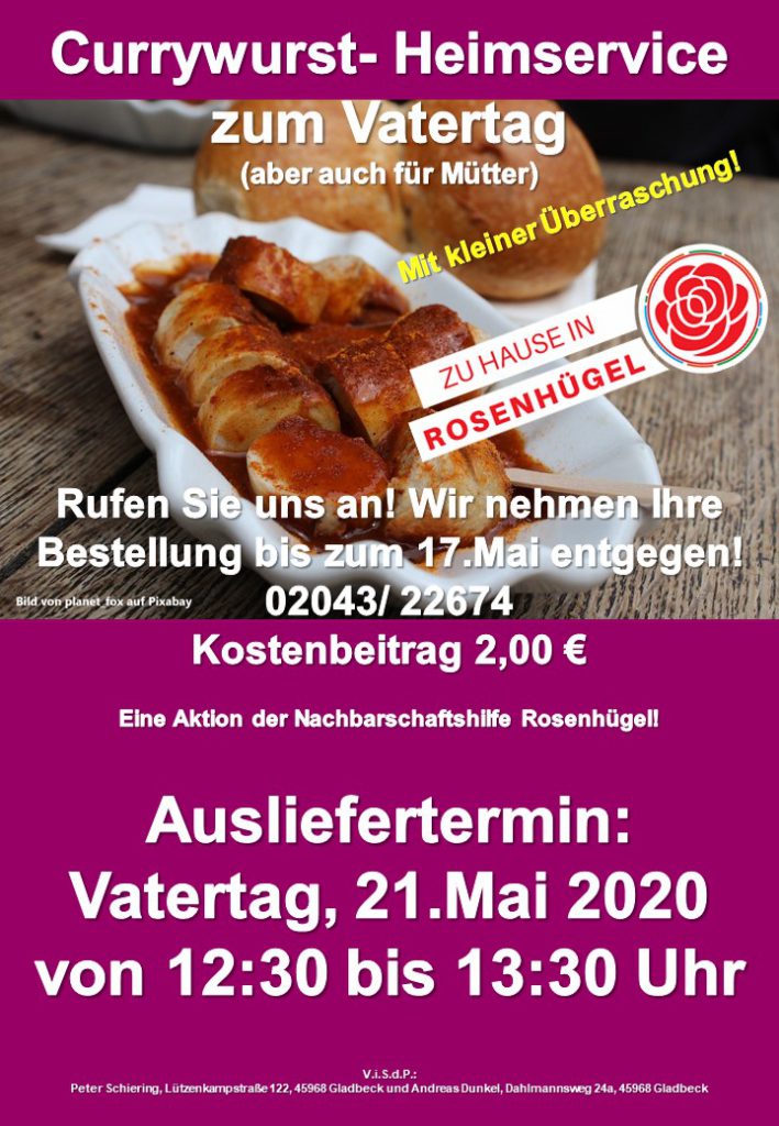 Gladbeck-Süd| Die Kontaktbeschränkungen wegen der Corona-Krise gehen bis in den Juni weiter. Deshalb hat sich die Nachbarschaftshilfe Rosenhügel dazu entschlossen, zum Vatertag zum vorerst letzten Mal einen Mittgastisch als Heimservice auf die Beine zu stellen. Es gibt Currywurst (auch für Mütter). Die Organisatoren Peter Schiering und Andi Dunkel dazu: