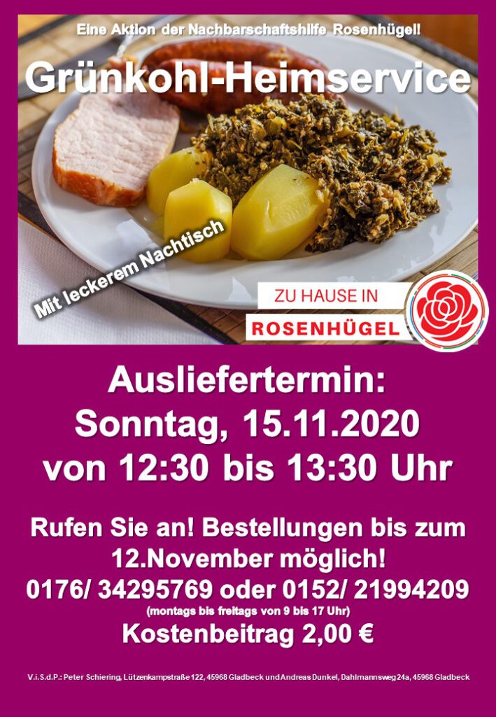 Rosenhügel | „Wir erleben zurzeit die 2.Welle der Corona-Pandemie. Deswegen bietet die Nachbarschaftshilfe Rosenhügel am Sonntag, den 15.November, erneut einen Mittagstisch als Heimservice an. Diesmal haben wir, der Jahreszeit entsprechend, einen Grünkohleintopf mit oder ohne Mettwurst und einen leckeren Nachtisch im Angebot“, so die Organisatoren Peter Schiering (Siedlerring) und Andi Dunkel (SPD-Ortsverein).